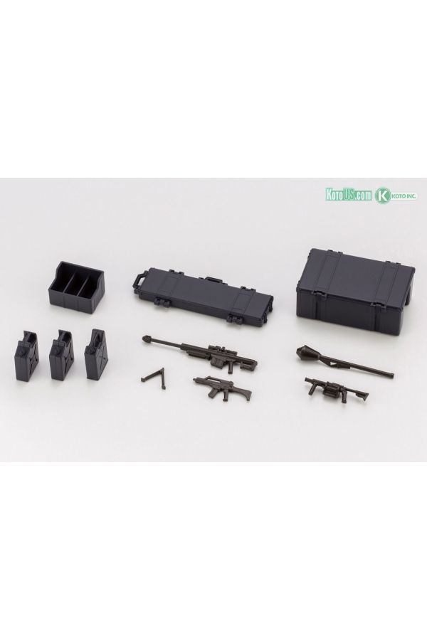 The main container can be opened and closed to store the included weapons and accessories inside. The same also applies to the rifle case as users can store the included Anti-Material Rifle inside. The two different tanks can be stored inside of the case included with this model. Use the 3mm connection port to attach to other Hexa Gear models sold separately to create different scenarios.