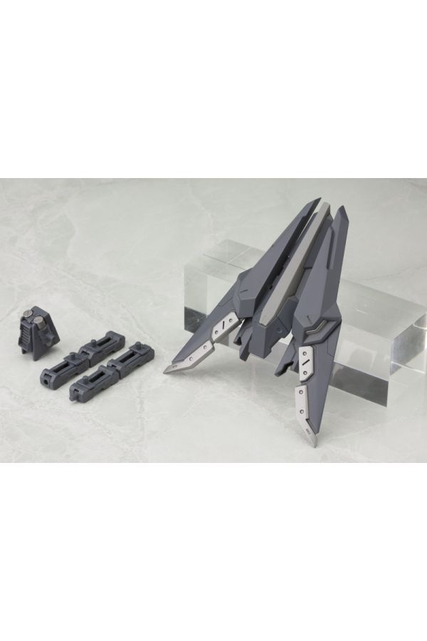 This unit can freely transform into a shield booster or layered shield for defense, and a photon cannon or big scissors for offense. Use all the parts to create a support fighter or a range of other modes—the possibilities are endless. The multi-item hanger, the series' first fully-fledged back unit, can also be freely mounted to previously released weapon units and other items. The arms are also fully articulated using slide rails and PC parts.